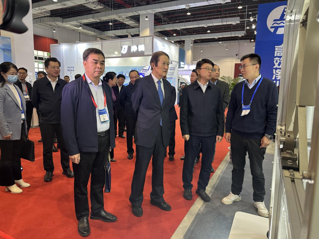 11月18日,中华环保联合会主席孙晓华(左二)、江西省人民政府副省长史可(右二)、自治区生态环境厅二级巡视员廖居卫(左一)参观展览