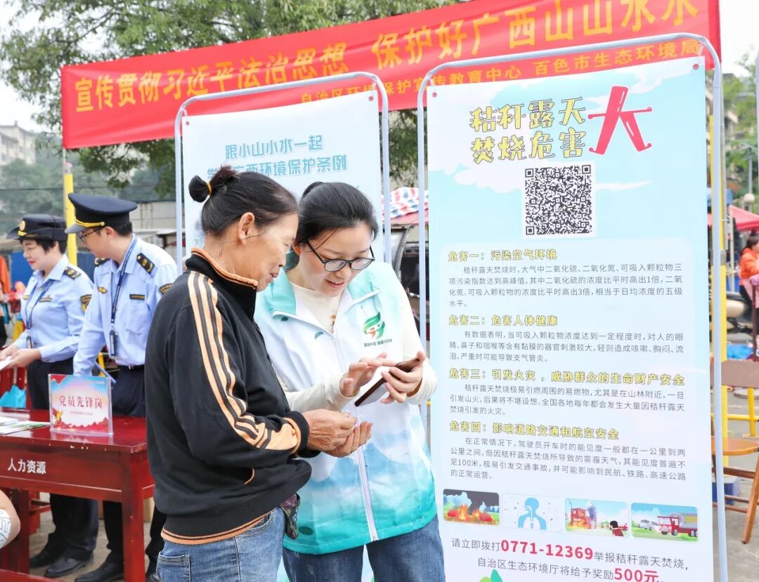 在崇左,宣传组走进江州镇、濑湍镇开展主题宣传活动,向过往群众科普秸秆露天焚烧危害大等环境保护知识,引导群众深入了解生态环境保护法律知识,为守住崇左山清水秀生态好的金字招牌贡献力量。