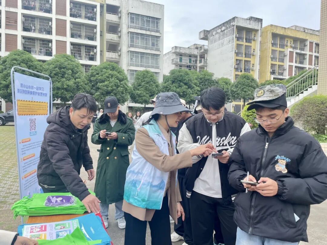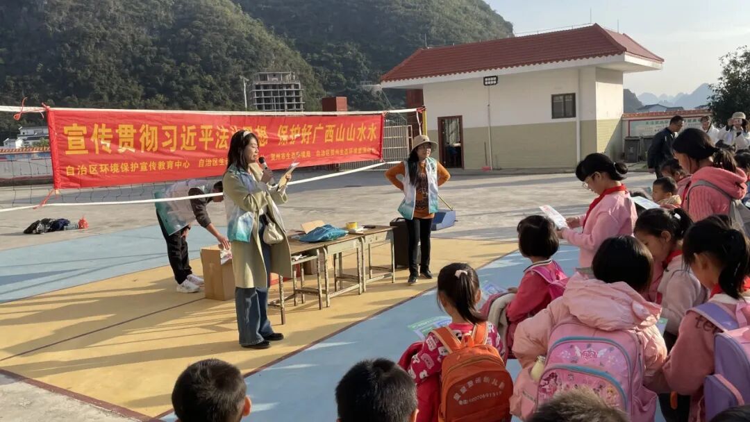 在防城港,宣传组走进东兴市京族学校,通过悬挂横幅、有奖问答互动、发放宣传手册、引导群众关注公众号、观看视频等方式,给数百名师生上了一堂生动的环境保护课。