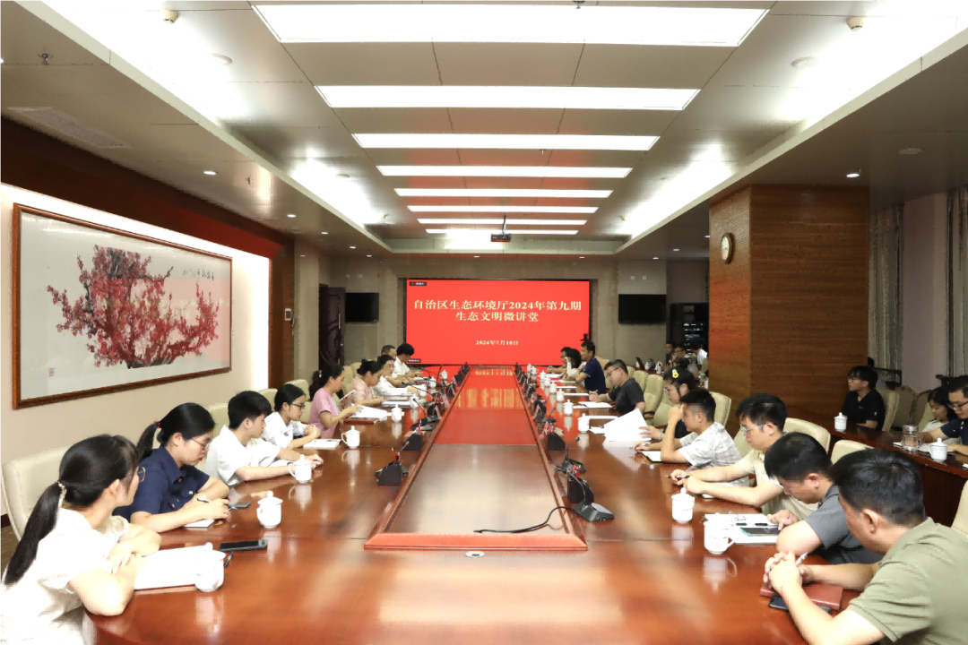 报告会线上线下同时进行,自治区生态环境厅党组成员、副厅长黄颖,各处室及在邕直属单位在南宁主会场参会,各市生态环境局设分会场视频参会。