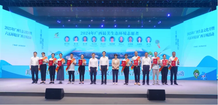 活动现场,与会领导为2024年广西最美生态环境志愿者颁奖,赞扬志愿者们为广西环保事业无私奉献的崇高精神,鼓励大家继续积极投身环保志愿行动。随后,与会领导共同启动2025年广西生态文化月暨六五环境日广西主场活动。在活动最后,最美生态环境志愿者共同宣读“美丽中国我先行”倡议,号召全社会为美丽中国建设贡献力量。
