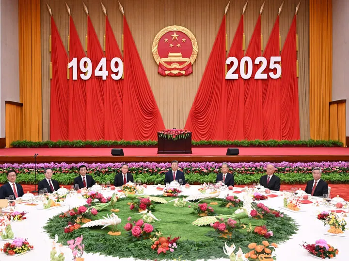 9月30日晚,庆祝中华人民共和国成立76周年招待会在北京人民大会堂举行。中共中央总书记、国家主席、中央军委主席习近平出席招待会并发表重要讲话。新华社记者 燕雁 摄庆祝中华人民共和国成立76周年招待会30日晚在人民大会堂举行。中共中央总书记、国家主席、中央军委主席习近平出席招待会并发表重要讲话。他强调,实现中华民族伟大复兴是前无古人的伟大事业。憧憬和挑战,都激发我们只争朝夕、永不懈怠的奋斗精神。我们要更加紧密地团结在党中央周围,锐意进取、埋头苦干,奋力谱写中国式现代化更加绚丽的篇章。9月30日晚,庆祝中华人民共和国成立76周年招待会在北京人民大会堂举行。习近平、李强、赵乐际、王沪宁、蔡奇、丁薛祥、李希、韩正等党和国家领导人与中外人士欢聚一堂,共庆中华人民共和国华诞。新华社记者 谢环驰 摄李强主持招待会,赵乐际、王沪宁、蔡奇、丁薛祥、李希、韩正出席招待会。约800名中外人士欢聚一堂,共庆中华人民共和国华诞。人民大会堂宴会厅华灯璀璨,洋溢着喜庆热烈的节日氛围。主席台上方高悬着庄严的国徽,“1949-2025”大字年号在鲜艳红旗映衬下格外醒目。17时30分许,在欢快的《迎宾曲》中,习近平等党和国家领导人步入宴会厅,向大家挥手致意,全场响起热烈掌声。招待会开始。全场起立,高唱中华人民共和国国歌,雄壮的《义勇军进行曲》在大厅回荡。习近平发表重要讲话。他首先代表党中央和国务院,向全国各族人民、向中国人民解放军指战员和武警部队官兵、向各民主党派和无党派人士致以节日祝贺,向香港特别行政区同胞、澳门特别行政区同胞、台湾同胞和海外侨胞致以诚挚问候,向长期以来关心和支持中国建设事业的友好国家和国际友人致以衷心感谢。习近平指出,新中国76年来,党领导人民自力更生、接续奋斗,取得彪炳史册的辉煌成就。回望历史,中华民族从濒临危亡走向伟大复兴,一路筚路蓝缕、充满艰辛,也一路豪情满怀、凯歌高奏。前不久,我们隆重纪念中国人民抗日战争暨世界反法西斯战争胜利80周年,极大振奋了民族精神、激发了爱国热情、凝聚了奋斗力量。要继续用好历史经验,把国家建设得更好,让老一辈领导人和革命先烈开创的事业不断欣欣向荣。习近平强调,今年以来,面对复杂形势,我们进一步全面深化改革,扎实推动高质量发展,着力保障和改善民生,纵深推进全面从严治党,党和国家各项事业取得新进展新成效。下个月,我们党将召开二十届四中全会,研究制定“十五五”规划建议。要紧紧围绕新时代新征程党的中心任务,把“十五五”发展的目标任务和战略举措规划好实施好,确保基本实现社会主义现代化取得决定性进展。习近平指出,新征程上,我们要坚定不移贯彻“一国两制”方针,支持港澳更好融入国家发展大局,更好发展经济、改善民生。要深化两岸交流合作,坚决反对“台独”分裂行径和外部势力干涉,坚决捍卫国家主权和领土完整。习近平强调,面对百年变局加速演进的国际形势,我们要大力弘扬全人类共同价值,践行真正的多边主义,推动落实全球发展倡议、全球安全倡议、全球文明倡议、全球治理倡议,同各国携手构建人类命运共同体。在欢快的乐曲声中,中外宾朋举杯共贺中华人民共和国成立76周年,祝福中国繁荣昌盛、人民幸福安康,祝愿中国人民和世界各国人民友谊长存。出席招待会的还有:在京中共中央政治局委员、中央书记处书记、全国人大常委会副委员长、国务院副总理、国务委员、国家监察委员会主任、最高人民法院院长、最高人民检察院检察长、全国政协副主席和从领导职务上退下来的同志,以及中央军委委员、曾担任中央军委委员的同志。中央党政军群有关部门和北京市负责人,各民主党派中央、全国工商联负责人和无党派人士代表,在京功勋荣誉表彰奖励获得者代表,全国劳动模范和先进人物代表,为民族地区稳定、发展、团结作出重要贡献的少数民族代表人士,在京部分香港特别行政区人士、澳门特别行政区人士、台湾同胞和华侨、华人代表,各国驻华使节、各国际组织驻华代表、部分外国专家等也出席了招待会。