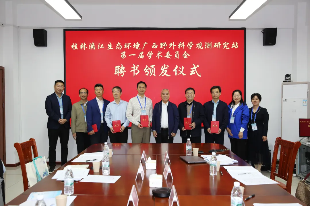 会前,宁耘与漓江野外观测站学术委员会主任、中国地质调查局岩溶地质研究所蒋忠诚研究员共同为观测站揭牌,并向首届学术委员会委员颁发聘书。