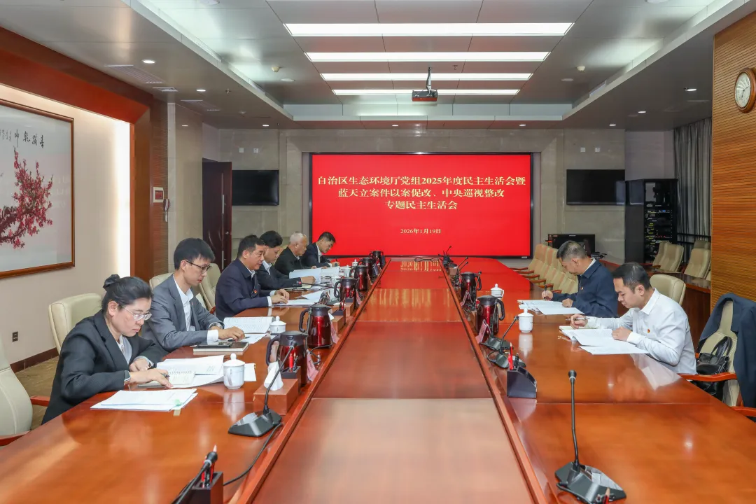 1月19日,自治区生态环境厅党组在南宁召开2025年度民主生活会暨蓝天立案件以案促改、中央巡视整改专题民主生活会。会议深入学习贯彻习近平新时代中国特色社会主义思想和习近平总书记听取二十届中央巡视省(自治区、直辖市)情况汇报时的重要讲话精神,全面贯彻落实党的二十届四中全会精神,深入贯彻落实习近平总书记关于广西工作论述的重要要求,以打攻坚战、持久战的决心和恒心,锲而不舍落实中央八项规定精神,推进作风建设常态化长效化,深刻剖析蓝天立严重违法违纪问题,以案促改、以案促治,全面落实中央第十三巡视组对广西开展巡视的反馈意见,扎实做好“后半篇文章”,以优良作风凝心聚力、真抓实干,奋力开创中国式现代化建设新局面。