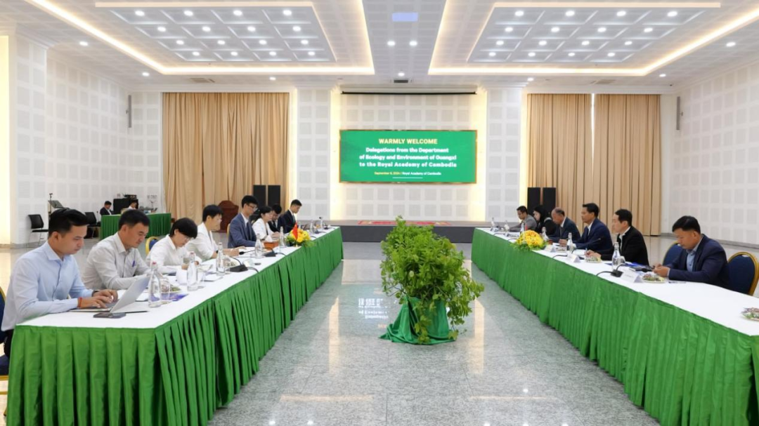 9月6日,广西生态环境代表团拜访柬埔寨皇家科学院,皇家科学院院长宋杜以及内阁主任、生物医学农业所所长、孔子学院院长、国际汉语教育与教师研究所所长一行参加了座谈交流,会上张兴赢感谢宋杜率团到广西南宁出席了今年六五环境日国家主场活动,并介绍了广西与柬埔寨在生态环境科技领域的合作情况及广西生态环境保护科研成果,邀请柬埔寨皇家科学院参加即将在广西举行的2024年中国—东盟环境合作论坛。特别介绍了当前广西正在建设的中国—东盟生态环境科技联合研究院,希望柬埔寨皇家科学院能够参与建设并联合成立相关的研究中心,务实推进双方在生态环境科技领域的合作交流。宋杜对广西生态环境代表团的到来表示热烈欢迎,对广西在生态环境保护领域取得的成就表示由衷的敬佩,会上介绍了科学院基本情况及所辖的国家森林公园保护成效,各个机构的相关负责人介绍了相关院所的发展情况,双方充分交流并就具体的合作事项达成共识。