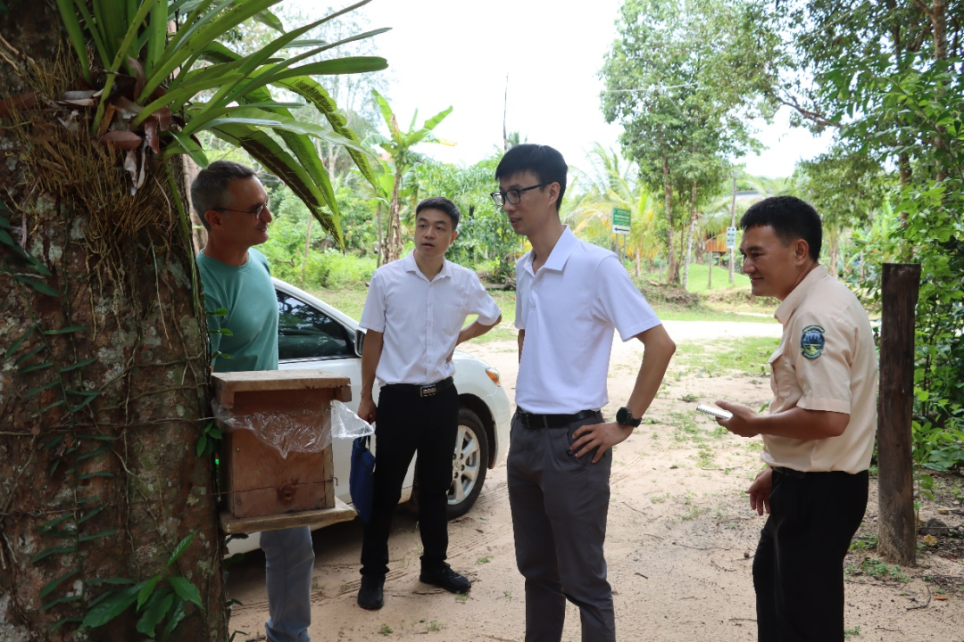 与来自法国的国际环保组织志愿者交流荔枝山蜜蜂养殖情况