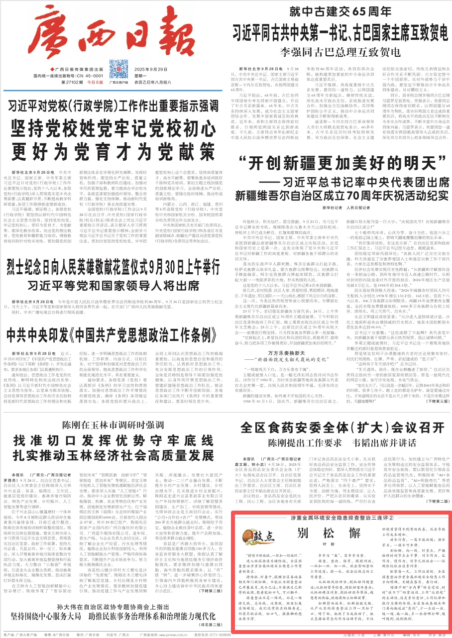 今日(9月29日),广西日报头版刊发“鼓点”评论文章《涉重金属环境安全隐患排查整治三连评②:别松懈》。全文如下——