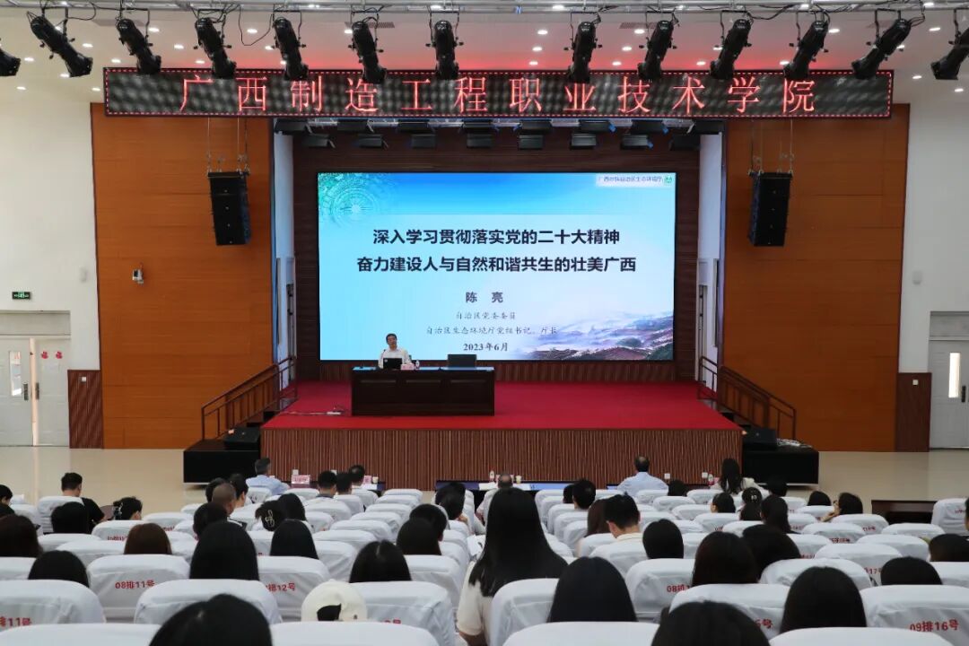 为贯彻落实中央、自治区关于领导干部上讲台开展思想政治教育的部署要求,近日,自治区生态环境厅党组书记、厅长陈亮来到广西制造工程职业技术学院,为学校师生作题为《深入学习贯彻落实党的二十大精神 奋力建设人与自然和谐共生的壮美广西》的思想政治教育报告。广西制造工程职业技术学院校长吴炳科主持报告会。