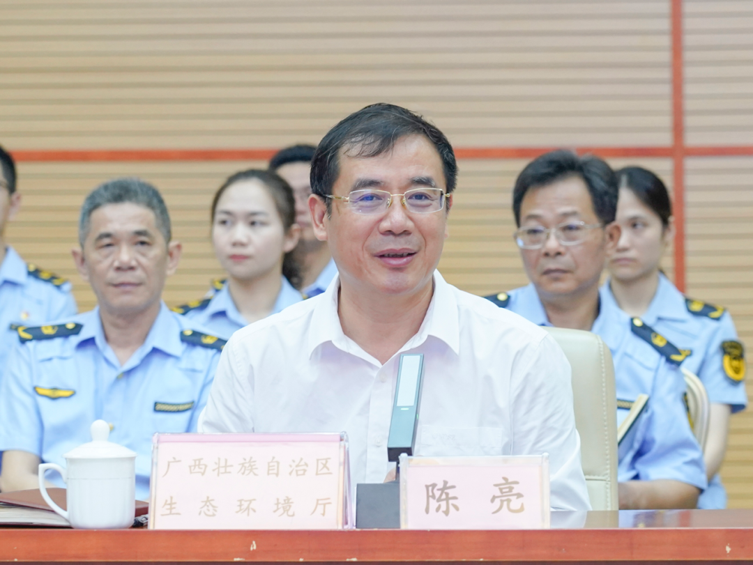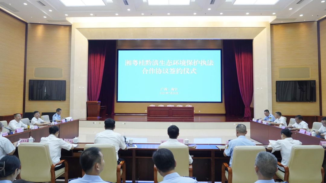 陈亮指出,湘粤桂黔滇五省(区)位于祖国南部,同属珠江水系,山水相连,陆海相通,水系发达,拥有西江上游水源涵养与土壤保持区、南岭、大瑶山等多个国家重要生态功能区,是我国“两屏三带”生态安全战略格局的重要组成部分。签署《湘粤桂黔滇生态环境保护执法合作协议》(以下简称《合作协议》)是深入贯彻落实习近平生态文明思想、习近平总书记对广西“五个更大”重要要求,认真落实全国生态环境保护大会、2023年泛珠三角区域合作行政首长联席会议精神的重要举措,对进一步完善泛珠三角区域生态环境执法监管机制,深化跨区域生态流域联防联控协作,筑牢祖国南方重要生态安全屏障,深入打好污染防治攻坚战具有重要的意义。