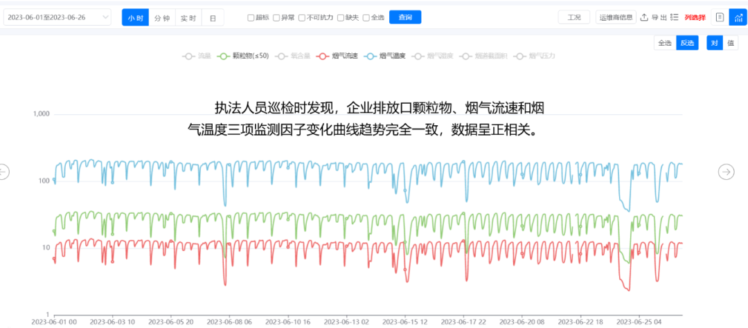 2023年6月,百色市生态环境局执法人员在广西固定污染源自动监控平台巡检时发现,德保县某锰矿加工有限公司矿热炉烟气排放口颗粒物、烟气流速和烟气温度三项监测因子自动监测数据变化趋势完全一致(三项监测因子无相关性),存在造假嫌疑。
