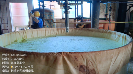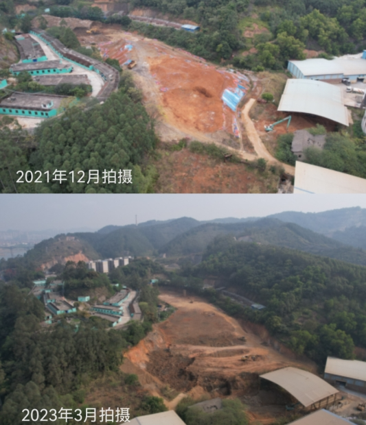上图为广西某钛业有限公司2021年12月固体废物堆场航拍图,堆场内几乎已堆满钛石膏,堆高约与左侧养殖场同高;下图为该公司2023年3月固体废物堆场航拍图,堆场内堆放的钛石膏与左侧养殖场落差较大。
