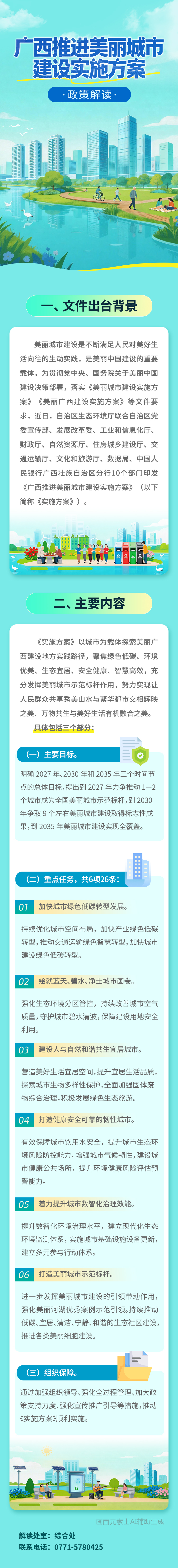 美丽城市建设是不断满足人民对美好生活向往的生动实践,是美丽中国建设的重要载体。为贯彻党中央、国务院关于美丽中国建设决策部署,落实《美丽城市建设实施方案》《美丽广西建设实施方案》等文件要求,近日,自治区生态环境厅联合自治区党委宣传部、发展改革委、工业和信息化厅、财政厅、自然资源厅、住房城乡建设厅、交通运输厅、文化和旅游厅、数据局、中国人民银行广西壮族自治区分行10个部门印发《广西推进美丽城市建设实施方案》(以下简称《实施方案》)。