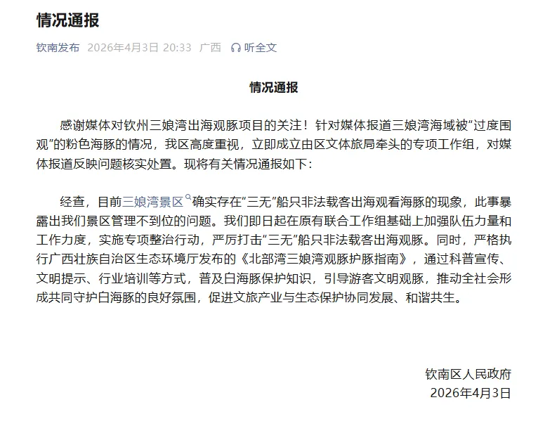 感谢媒体对钦州三娘湾出海观豚项目的关注!针对媒体报道三娘湾海域被“过度围观”的粉色海豚的情况,我区高度重视,立即成立由区文体旅局牵头的专项工作组,对媒体报道反映问题核实处置。现将有关情况通报如下: