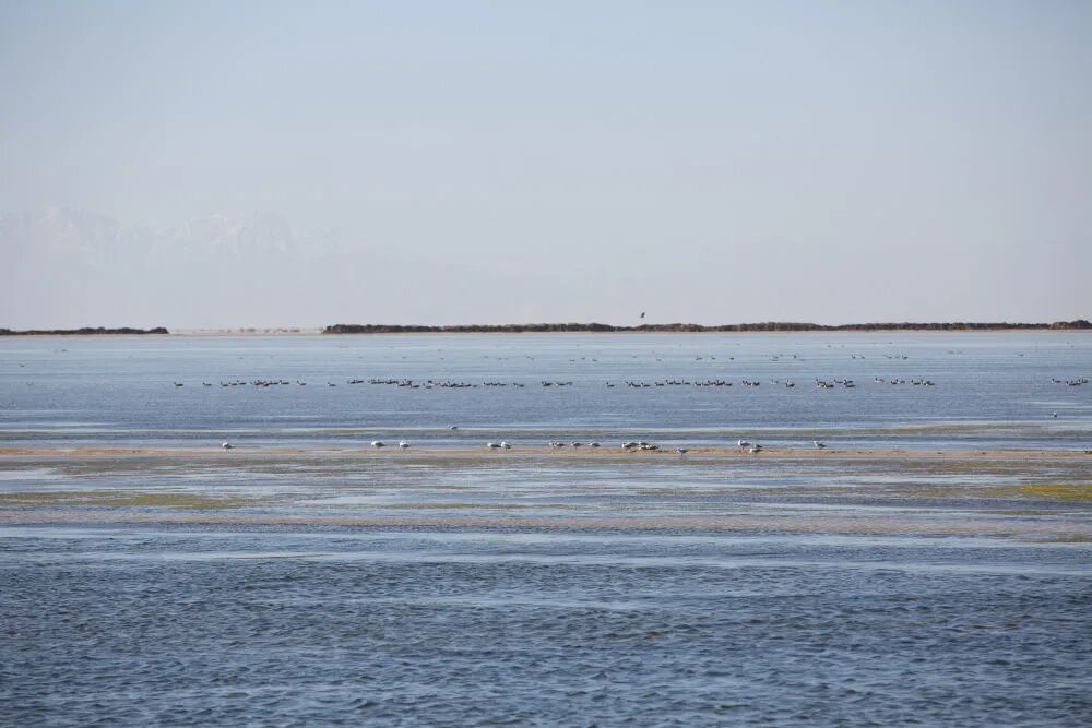 鸟儿在青海察尔汗盐湖边的淡水湖上栖息(2017年9月10日摄)。新华社记者 金立旺 摄