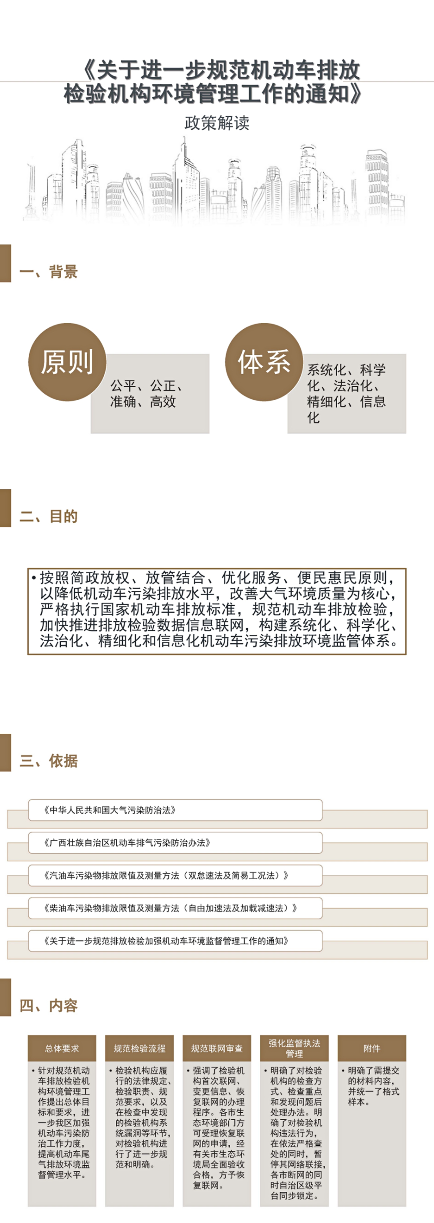 按照简政放权、放管结合、优化服务、便民惠民原则,以降低机动车污染排放水平,改善大气环境质量为核心,严格执行国家机动车排放标准,规范机动车排放检验,加快推进排放检验数据信息联网,构建系统化、科学化、法治化、精细化和信息化机动车污染排放环境监管体系。