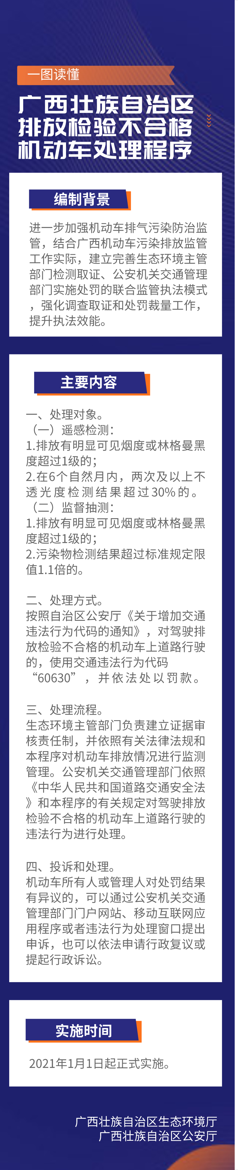 (一)明确处理对象。根据遥感检测(包括冒黑烟抓拍)和监督抽测两种不同手段分别明确处理对象。以《柴油车污染物排放限值及测量方法(自由加速法及加载减速法)》《在用柴油车排气污染物排放测量方法及技术要求(遥感检测法)》《汽油车污染物排放限值及测量方法(双怠速法及简易工况法)》为依据,判断排放检验不合格机动车。按照《广西壮族自治区公安厅关于增加交通违法行为代码的通知》,对驾驶排放检验不合格的机动车上道路行驶的违法行为依法进行处理。