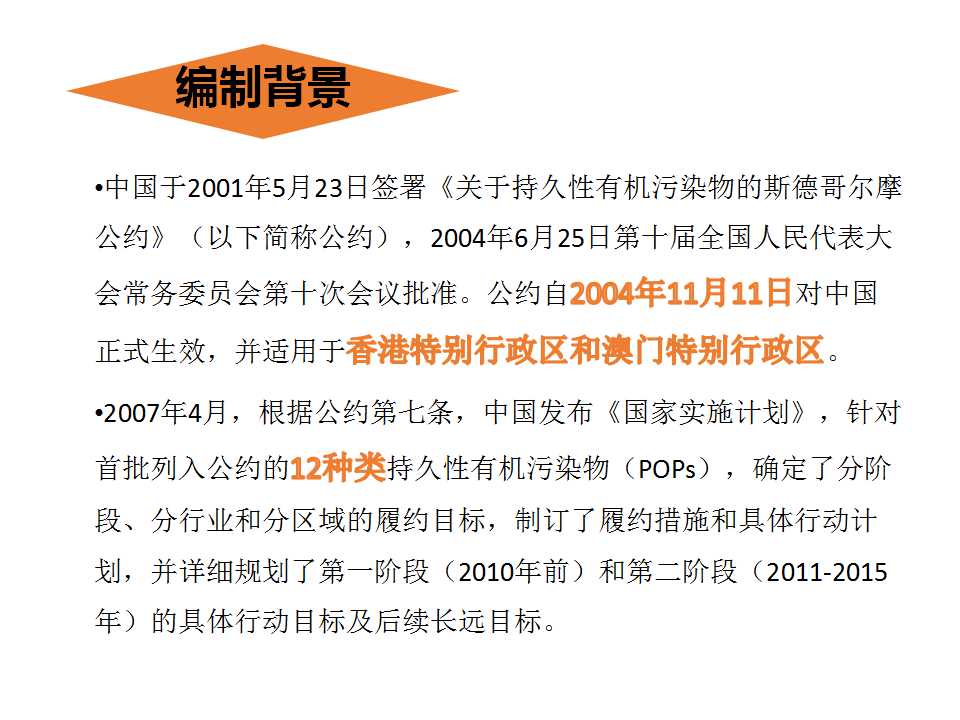 中国于2001年5月23日签署《关于持久性有机污染物的斯德哥尔摩公约》(以下简称公约),2004年6月25日第十届全国人民代表大会常务委员会第十次会议批准。公约自2004年11月11日对中国正式生效,并适用于香港特别行政区和澳门特别行政区。