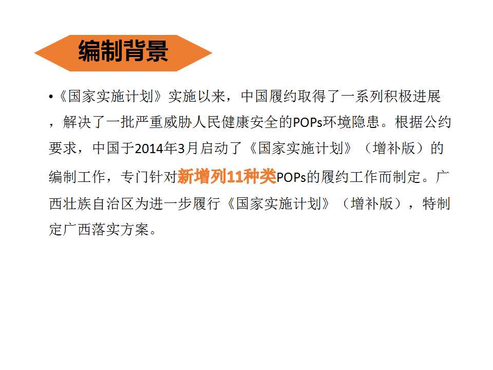 《国家实施计划》实施以来,中国履约取得了一系列积极进展,解决了一批严重威胁人民健康安全的POPs环境隐患。根据公约要求,中国于2014年3月启动了《国家实施计划》(增补版)的编制工作,专门针对新增列11种类POPs的履约工作而制定。广西壮族自治区为进一步履行《国家实施计划》(增补版),特制定广西落实方案。