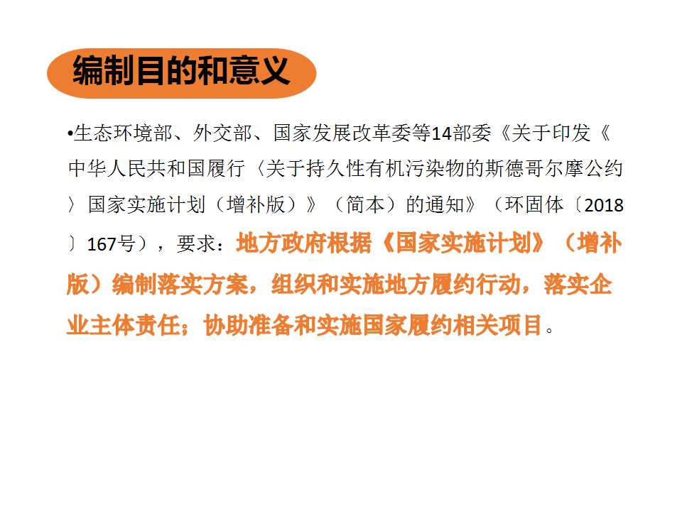 生态环境部、外交部、国家发展改革委等14部委《关于印发《中华人民共和国履行〈关于持久性有机污染物的斯德哥尔摩公约〉国家实施计划(增补版)》(简本)的通知》(环固体〔2018〕167号,以下简称《国家方案》),要求“地方政府根据《国家实施计划》(增补版)编制落实方案,组织和实施地方履约行动,落实企业主体责任;协助准备和实施国家履约相关项目。”为进一步细化工作任务,明确工作职责,自治区生态环境厅结合我区实际制定了《广西落实〈中华人民共和国履行《关于持久性有机污染物的斯德哥尔摩公约》国家实施计划(增补版)〉(简本)工作方案》(以下简称《方案》),进一步夯实我区各级各部门责任,落实履约责任。