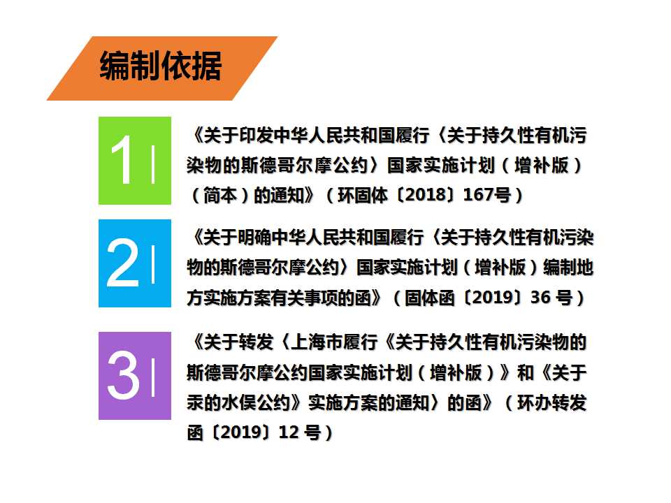 《关于印发中华人民共和国履行〈关于持久性有机污染物的斯德哥尔摩公约〉国家实施计划(增补版)(简本)的通知》(环固体〔2018〕167号)、《关于明确中华人民共和国履行〈关于持久性有机污染物的斯德哥尔摩公约〉国家实施计划(增补版)编制地方实施方案有关事项的函》(固体函〔2019〕36 号)、《关于转发〈上海市履行《关于持久性有机污染物的斯德哥尔摩公约国家实施计划(增补版)》和《关于汞的水俣公约》实施方案的通知〉的函》(环办转发函〔2019〕12 号)。