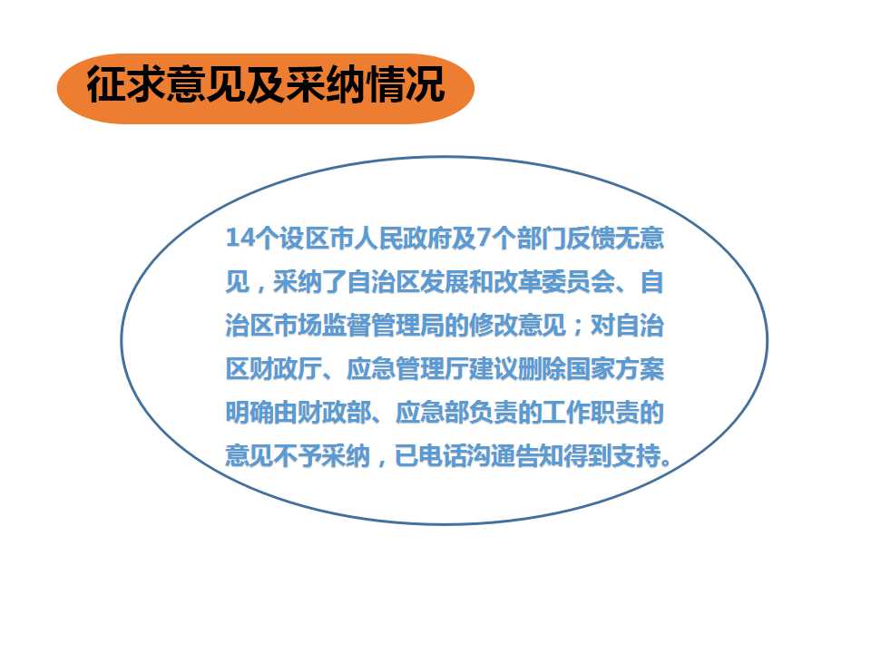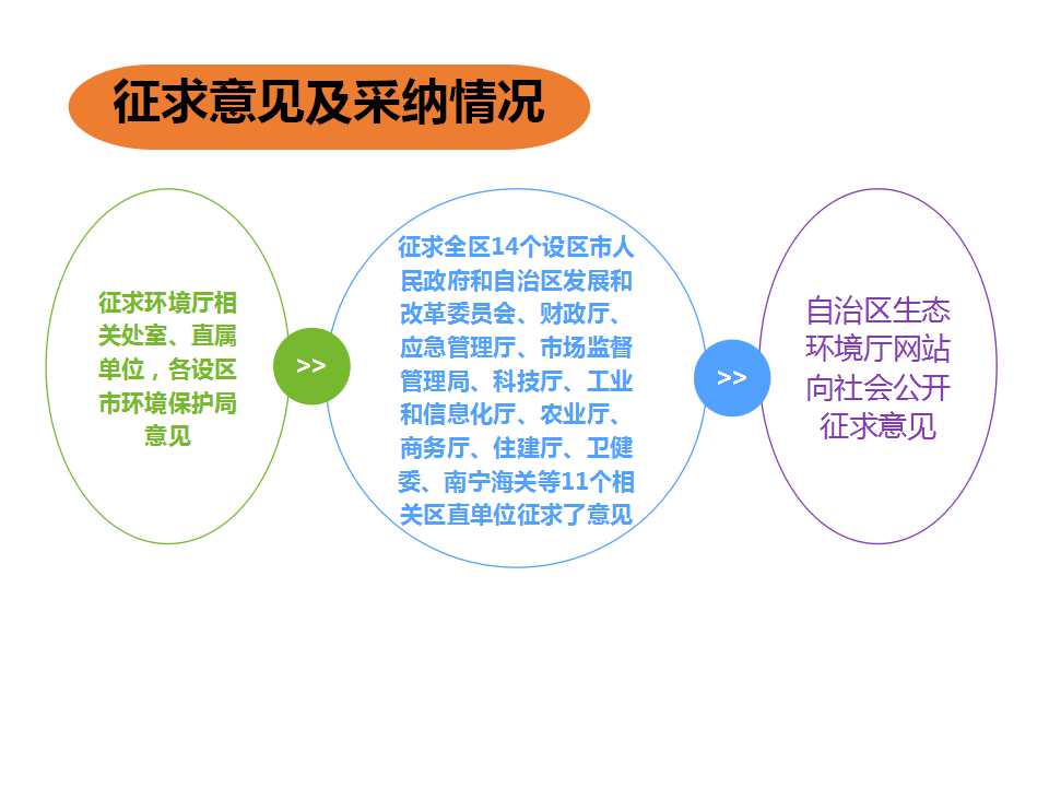 《方案》初稿编制后,首先征求自治区生态环境厅相关处室、直属单位,各设区市环境保护局意见,根据反馈意见进行修改完善,自治区生态环境厅向全区14个设区市人民政府和自治区发展和改革委员会、财政厅、应急管理厅、市场监督管理局、科技厅、工业和信息化厅、农业厅、商务厅、住建厅、卫健委、南宁海关等11个相关区直单位征求了意见。其中,14个设区市人民政府及7个部门反馈无意见,采纳了自治区发展和改革委员会、自治区市场监督管理局的修改意见;对自治区财政厅、应急管理厅建议删除国家方案明确由财政部、应急部负责的工作职责的意见不予采纳,已电话沟通告知得到支持。2019年12月30日-2020年1月3日,我厅在自治区生态环境厅网站向社会公开征求意见,未收到修改意见。
