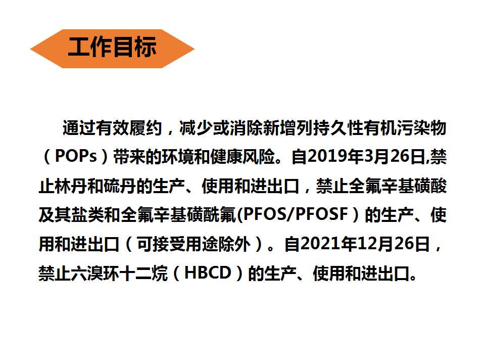 通过有效履约,减少或消除新增列持久性有机污染物(POPs)带来的环境和健康风险。自2019年3月26日,禁止林丹和硫丹的生产、使用和进出口,禁止全氟辛基磺酸及其盐类和全氟辛基磺酰氟(PFOS/PFOSF)的生产、使用和进出口(可接受用途除外)。自2021年12月26日,禁止六溴环十二烷(HBCD)的生产、使用和进出口。
