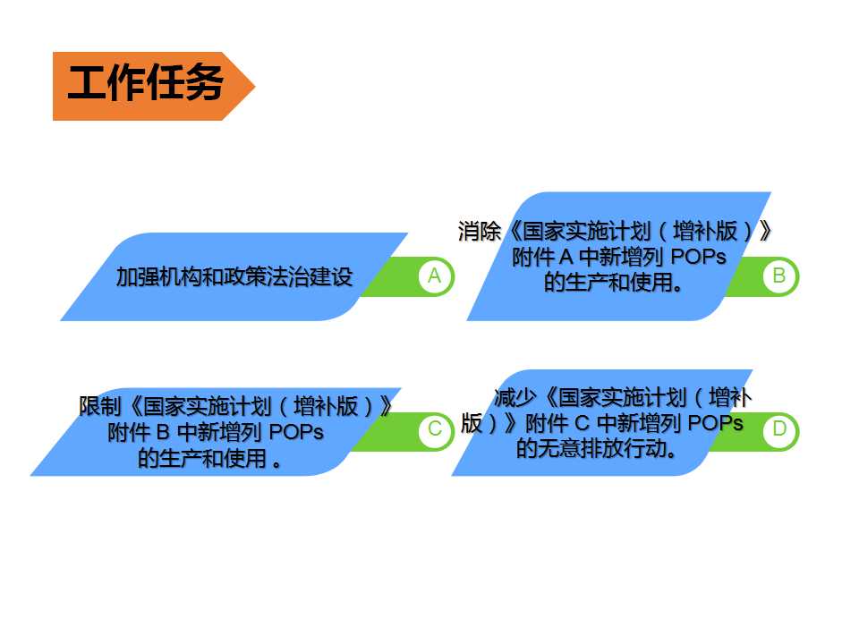 主要任务包括加强机构和政策法治建设、消除或限制新增列POPs的生产和使用、减少新增列POPs的无意排放行动、促进各方信息交流和公众宣传、加强研究、开发和监测等6项。