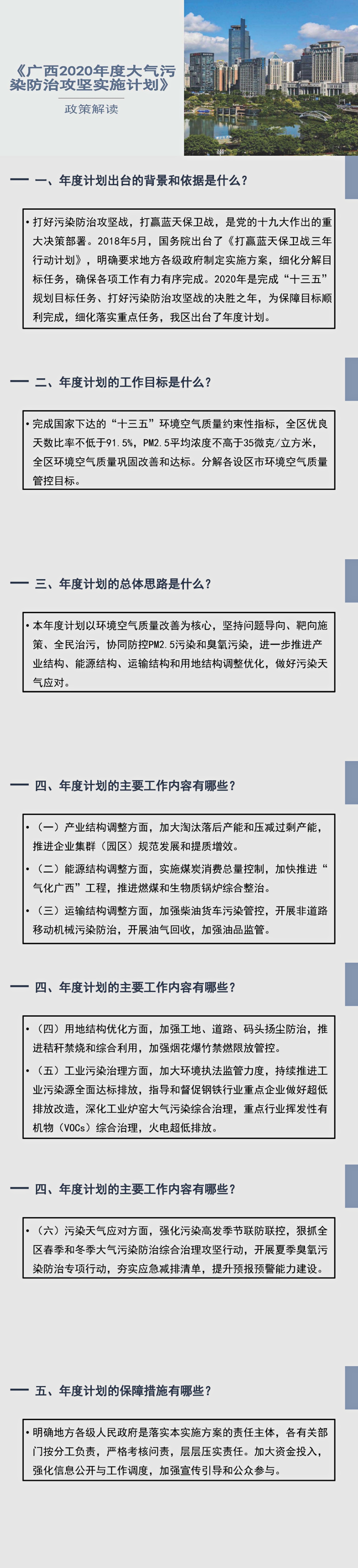 为贯彻落实国务院《打赢蓝天保卫战三年行动计划》和自治区《广西大气污染防治攻坚三年作战方案(2018—2020年)》,助力我区打好污染防治攻坚战、打赢蓝天保卫战,我区印发了《广西2020年度大气污染防治攻坚实施计划》(以下简称《年度计划》)。为指导和帮助公众更好地理解和执行新的规定,现解读如下: