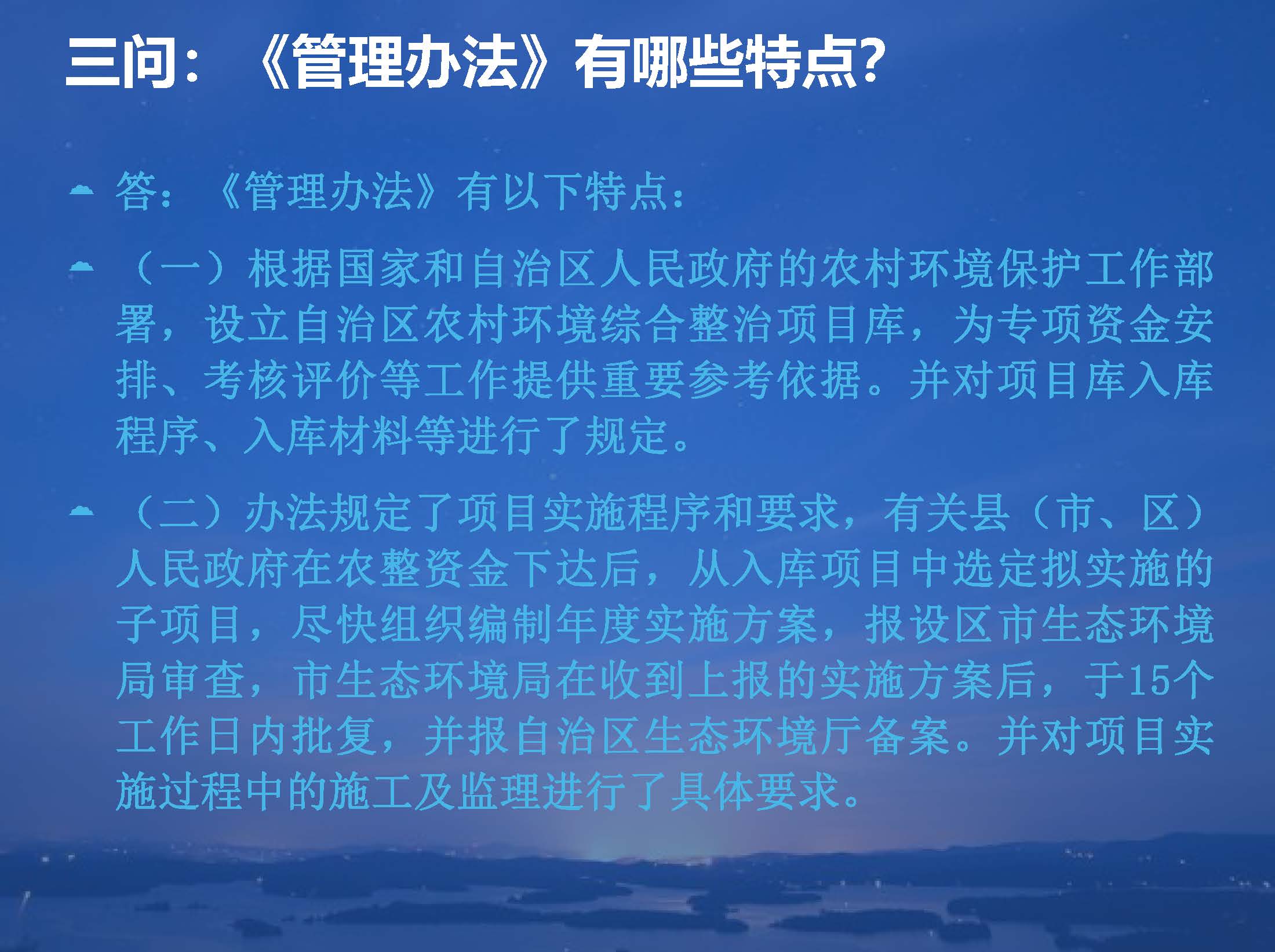 (二)办法规定了项目实施程序和要求,有关县(市、区)人民政府在农整资金下达后,从入库项目中选定拟实施的子项目,尽快组织编制年度实施方案,报设区市生态环境局审查,市生态环境局在收到上报的实施方案后,于15个工作日内批复,并报自治区生态环境厅备案。并对项目实施过程中的施工及监理进行了具体要求。
