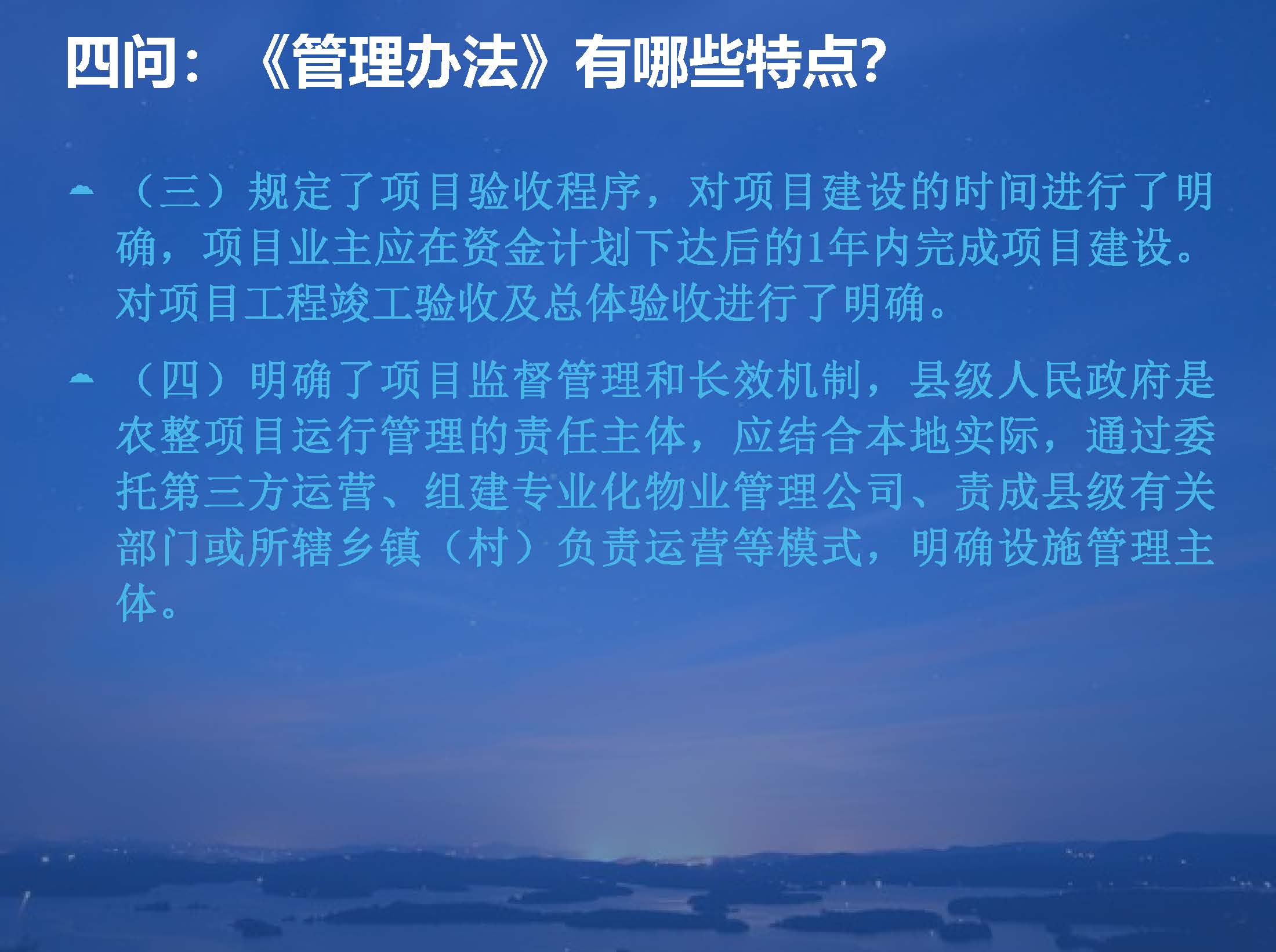 (四)明确了项目监督管理和长效机制,县级人民政府是农整项目运行管理的责任主体,应结合本地实际,通过委托第三方运营、组建专业化物业管理公司、责成县级有关部门或所辖乡镇(村)负责运营等模式,明确设施管理主体。