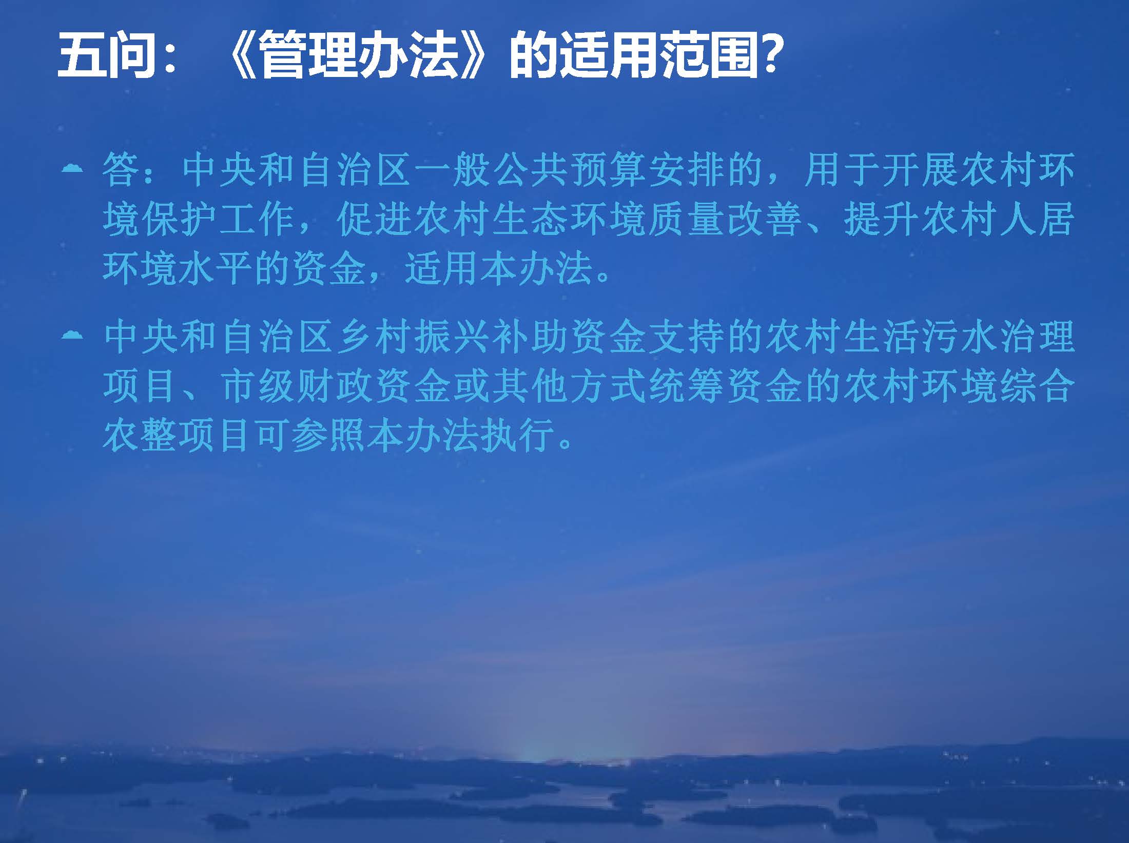 答:中央和自治区一般公共预算安排的,用于开展农村环境保护工作,促进农村生态环境质量改善、提升农村人居环境水平的资金,适用本办法。