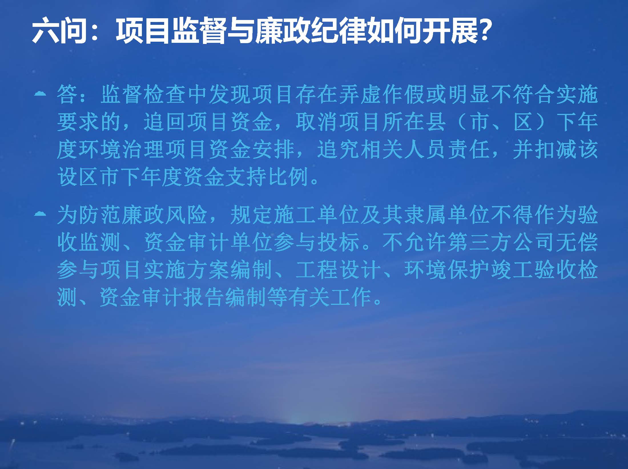 为防范廉政风险,规定施工单位及其隶属单位不得作为验收监测、资金审计单位参与投标。不允许第三方公司无偿参与项目实施方案编制、工程设计、环境保护竣工验收检测、资金审计报告编制等有关工作。