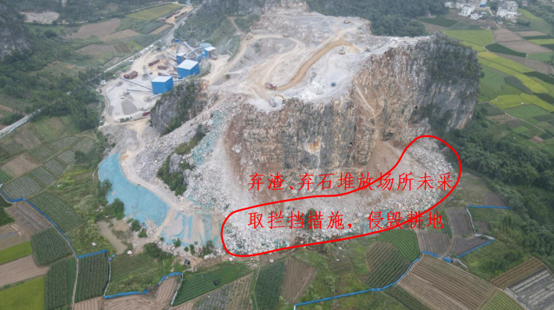 根据《水土保持法》第三十八条的要求,对废弃的砂、石、土、尾矿、废渣等存放地,应当采取拦挡、坡面防护、防洪排导等措施。现场督察发现,贺州市平桂区鹅塘镇贺州市合盛石材有限责任公司湴田西建筑石料用灰岩矿区弃渣、弃石堆放场所未采取拦挡措施,大量弃渣、弃石滑落,侵毁部分耕地。平桂区望高镇黄沙庙排废区堆积的大量废石废料未采取拦挡、截排水、坡面防护等措施,砂石土滚落导致下方排洪沟被填埋,丧失排洪功能。钟山县花山瑶族乡花山矿区对部分废弃的砂、石、土等存放地未采取拦挡、坡面防护措施,水土流失进入花山河,导致下游河段河水浑浊,河床沉积大量砂石。