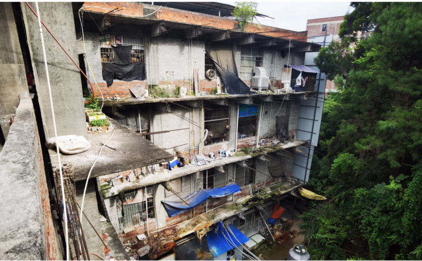 督察发现,顺达宝石加工集中区由一栋4层约1.5万平方米的烂尾楼改建而成,在建设时未同步配套建设相关污染防治设施。顺达公司为解决生产废水处理问题,在加工区楼顶建设了5个废水收集沉淀池,3个废水回用池,合计约700立方米,按要求处理后的废水回用不外排。但因废水处理效果不佳,废水存量大,回用率不高,处理后的废水排入污水管网。对废水收集池采样检测显示,pH值为3.8,呈酸性。顺达公司未能全部收集集中区内加工户的生产废水,部分废水未处理直接排入外环境,存在环境风险。顺达宝石加工集中区外的非法宝石加工户废水直排问题突出,导致城中村石人冲排洪沟水体呈乳白色。顺达宝石加工集中区厂房楼板较薄,楼顶和外墙侧立面钢筋裸露生锈,每一楼层安装大量宝石加工设备,以及楼顶建设的废水池、堆存的压滤废渣和建筑垃圾等,进一步增加楼体的负重,现场可见楼层多处开裂漏水,风险隐患突出。