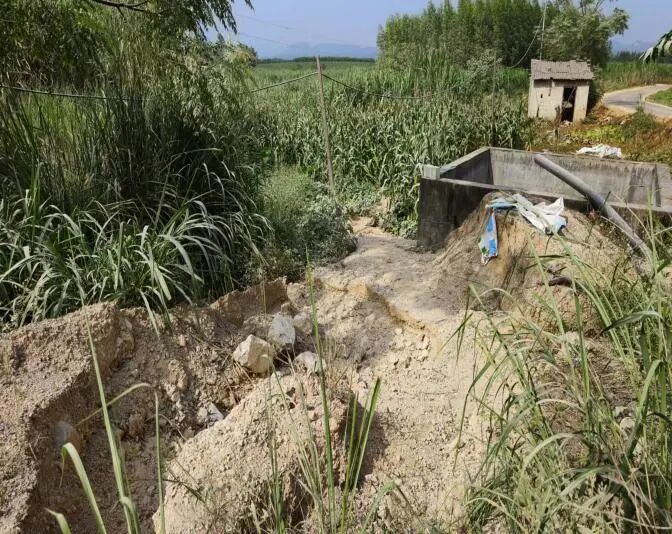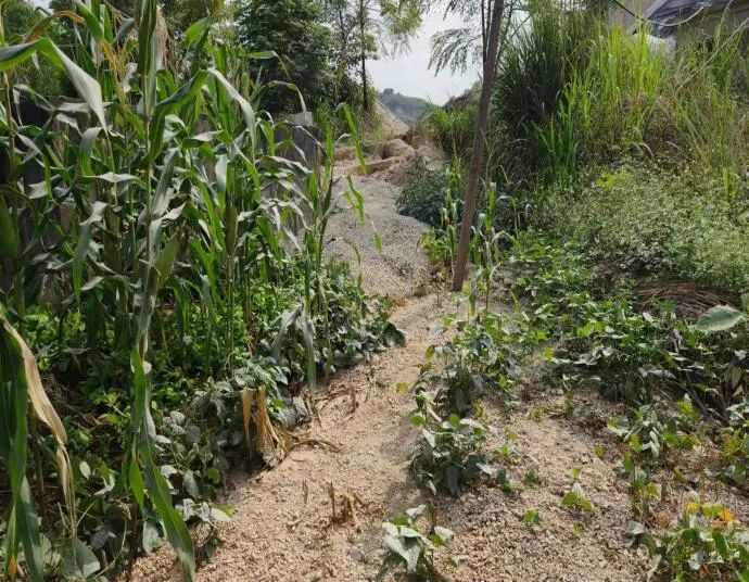 广西钢亿矿业有限公司大量泥砂碎石沿沉砂池旁的冲沟排入周边的玉米地