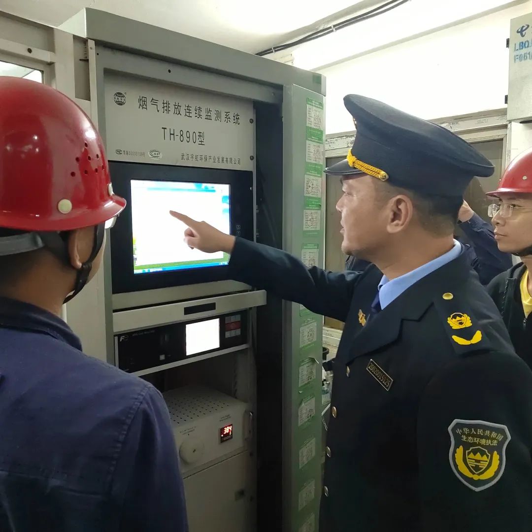执法人员对柳钢1#360烧结机废气排口污染源自动监控数据进行检查