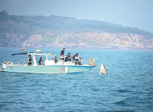 北海涠洲岛海域是全国唯一能够近岸观鲸的海域,一头布氏鲸突然出现在观鲸船的前方。(视觉中国供图)