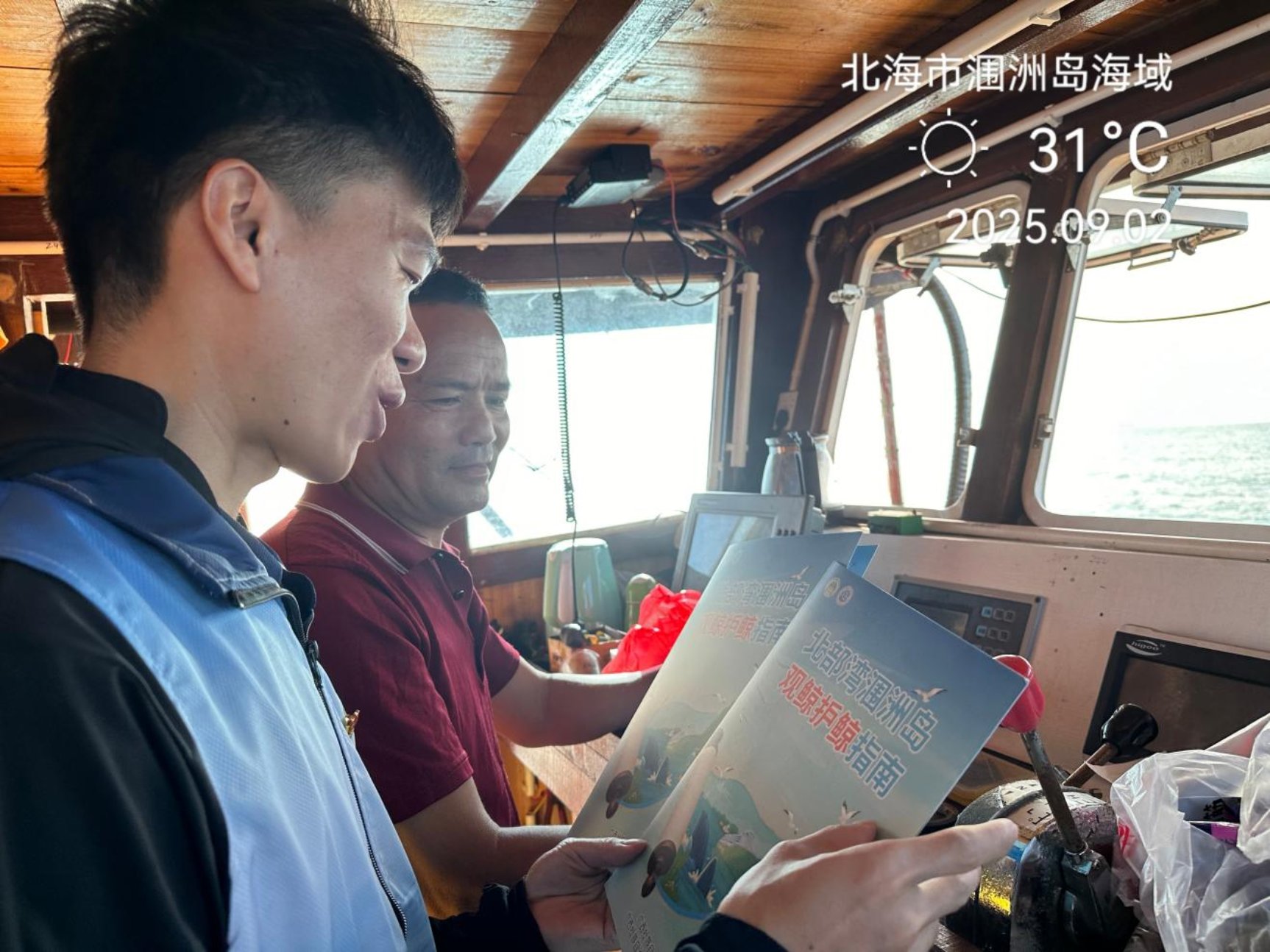 “布氏鲸是我国一级重点保护野生动物,我们要科学文明观鲸,如果在海上看见它们,可千万别开船追着它们拍,要保持300米以上距离才不会惊扰这些海上精灵......”一群身穿印着布氏鲸蓝色马甲的科普工作者,一边向沙滩的游客、渔民发放观鲸护鲸指南,一边耐心讲解。海风拂过蓝色马甲上的布氏鲸图案,与渔民认真倾听的神情交织在一起,成了清晨涠洲岛最温暖的生态守护图景。