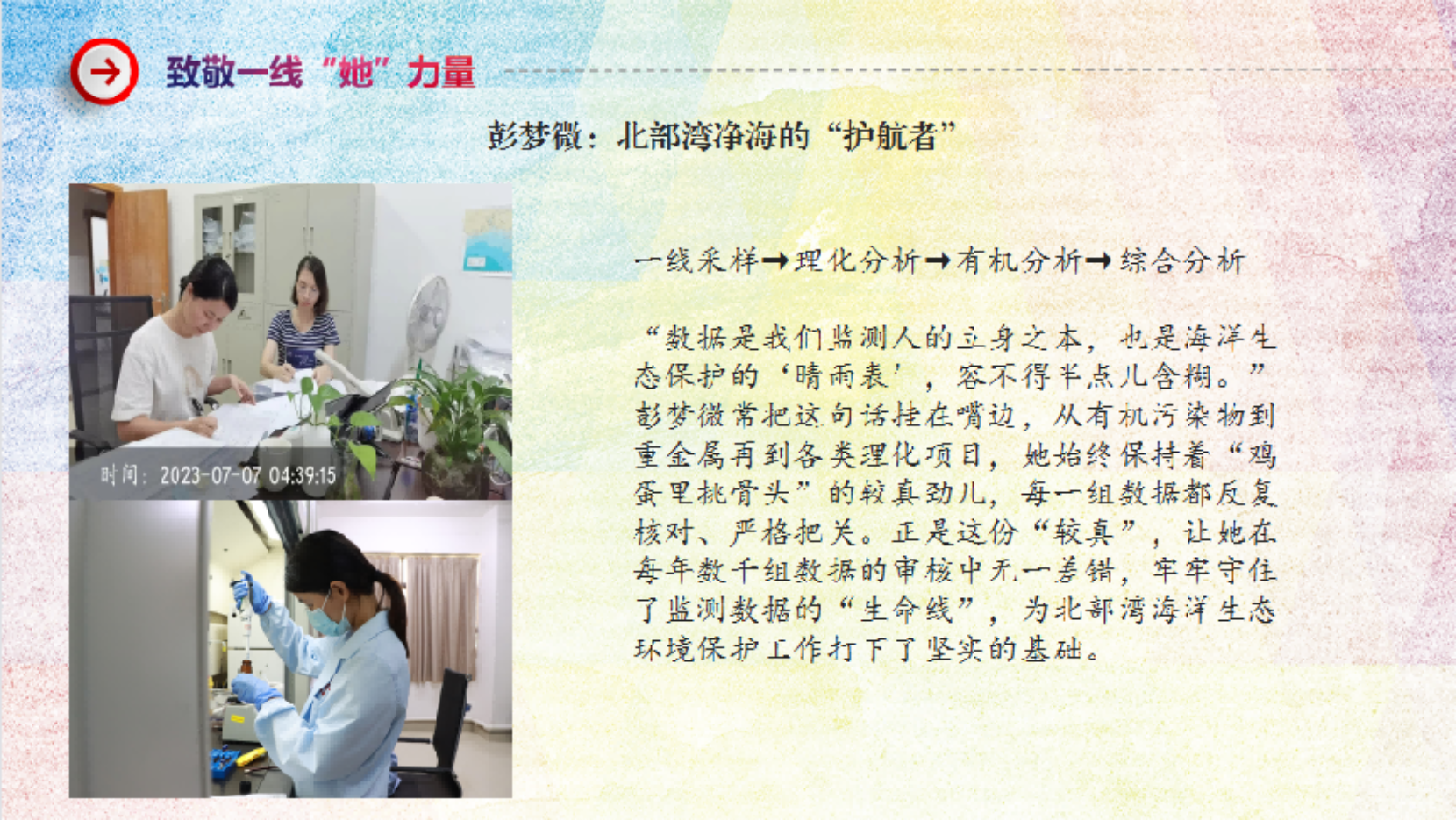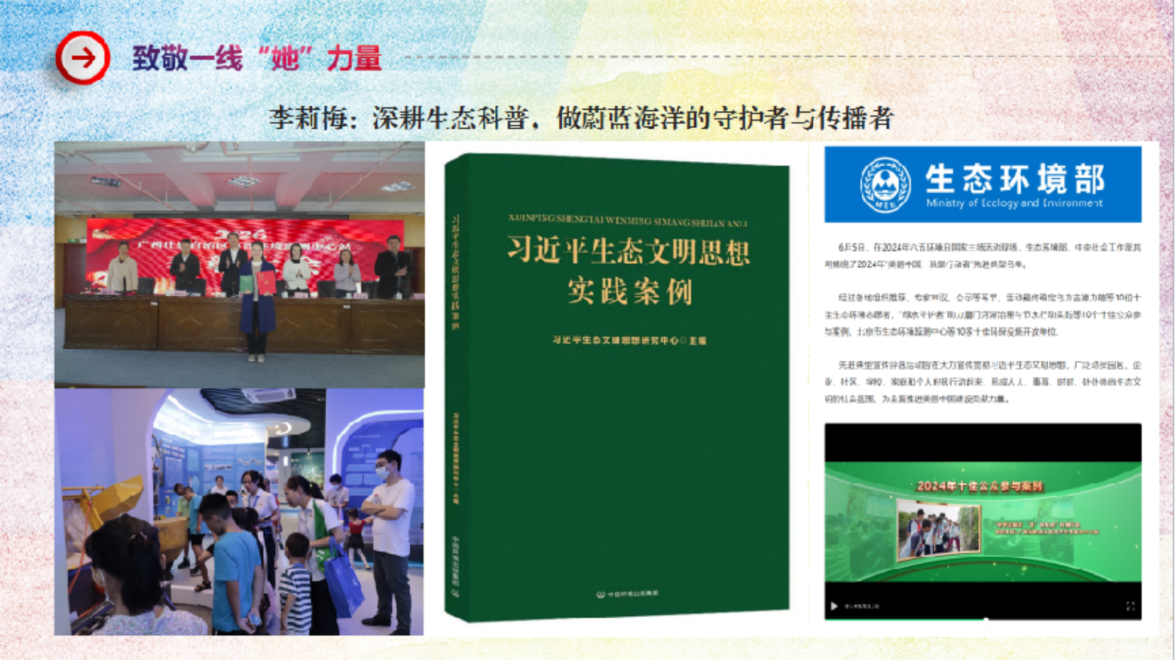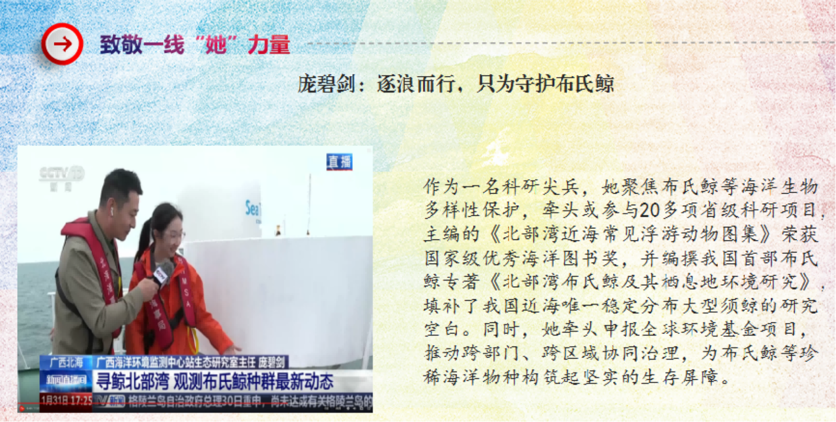 榜样引路,砥砺奋进建新功。身边榜样最动人,前行力量最持久。广西海洋站通过中国环境报、广西云-广西日报等官方媒体,宣传展示优秀女职工为海洋生态环境保护事业奋斗的故事。同时,组织开展优秀女性典型事迹学习分享会,通过“事迹宣讲+一图一故事”讲述站内“监测玫瑰”的榜样力量。她们中,有牵头建成全国首个海洋生态环境监测科普展厅的科普先锋;有攻克技术难关,搭建海水水质预报平台,实现国内首次7天水质业务化预报的技术骨干;有深耕生物多样性监测,守护北部湾“鲸喜”的生态卫士。这些扎根一线、默默奉献的巾帼故事,引发全体女职工强烈共鸣,激励大家以先进为标杆,在海洋生态环境监测岗位上勇担使命、再创佳绩。