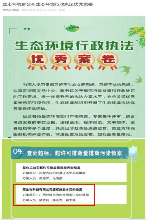 近日,从生态环境部传来捷报,在生态环境行政执法案卷评选中,由贵港市生态环境局办理并选送的案卷——《某生物科技有限公司超标排放水污染案》,凭借其严谨规范的办案程序、扎实确凿的证据链条和精准恰当的法律适用,从全国众多案卷中脱颖而出,获评“生态环境行政执法优秀案卷”。本次优秀案卷评选竞争激烈,标准严苛,贵港市生态环境局执法人员借助水质指纹溯源技术,快速识别污染迁移路径及锁定污染源,提升了环境违法案件查处的效率与精准度,形成了可借鉴、可复制的技术应用经验,得到了评审专家的高度认可。