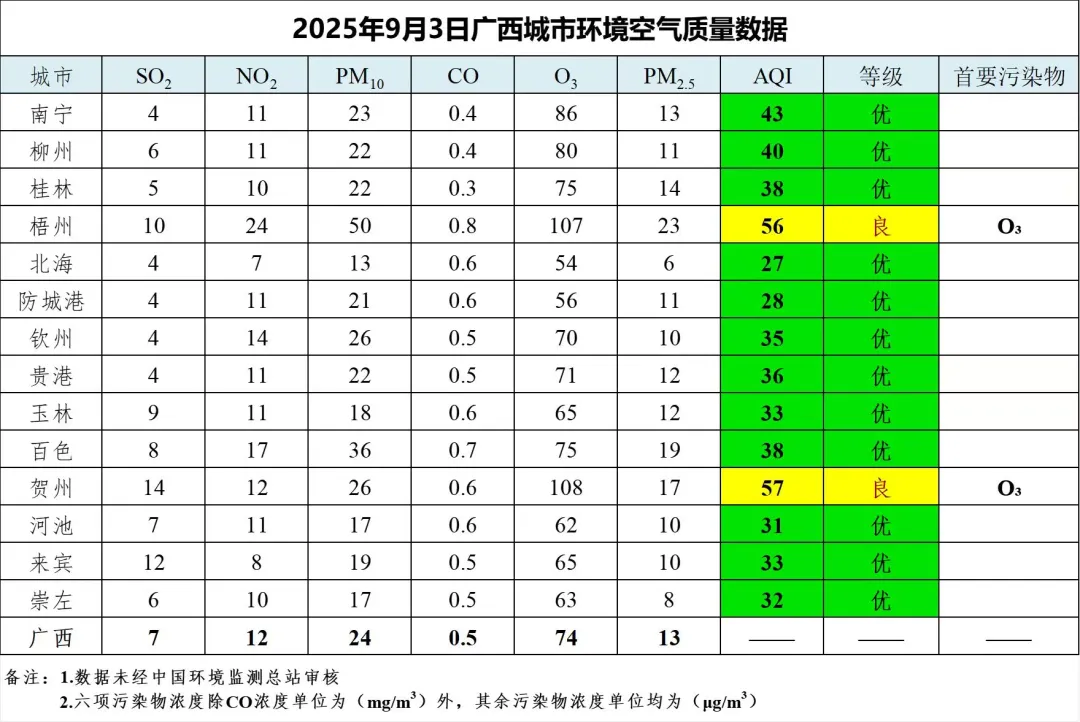 9月3日广西城市环境空气质量数据