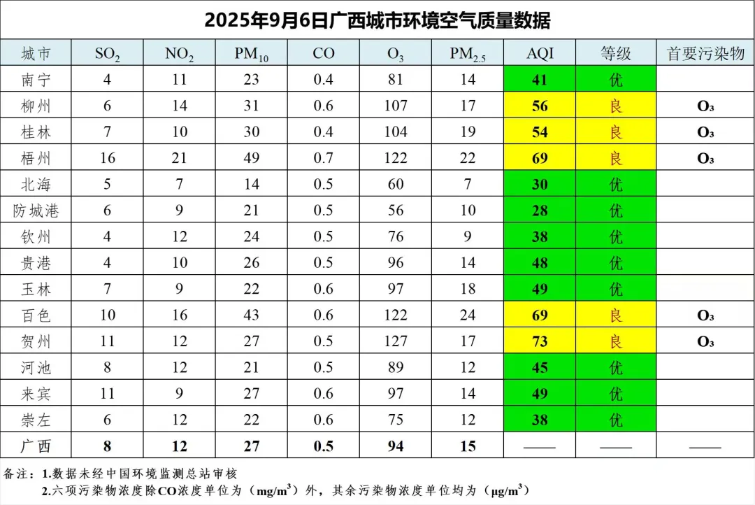 9月6日广西城市环境空气质量数据