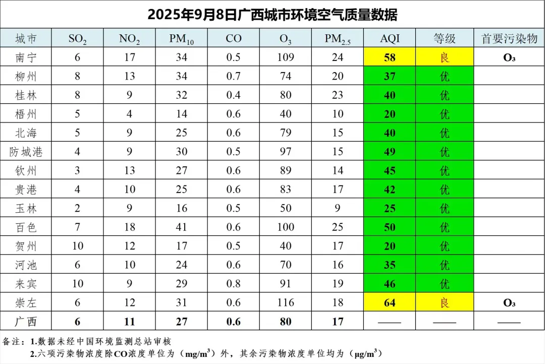 9月8日广西城市环境空气质量数据