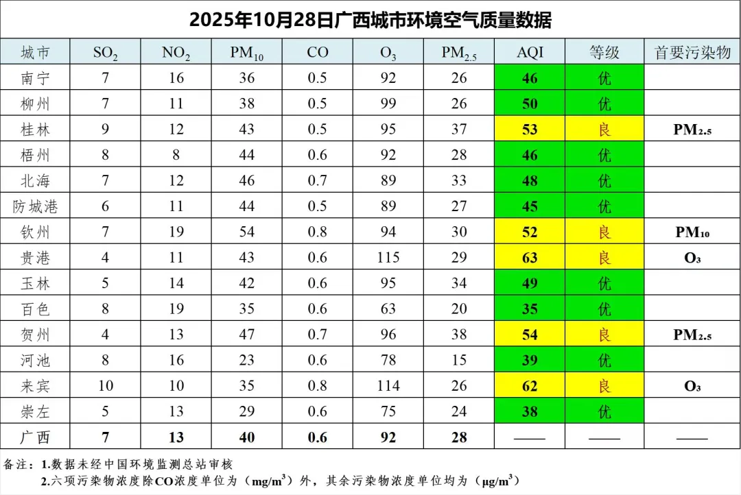 10月28日广西城市环境空气质量数据