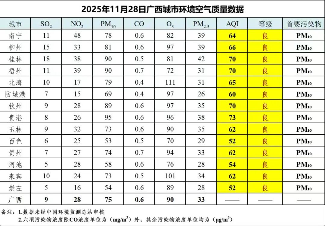 11月28日广西城市环境空气质量数据