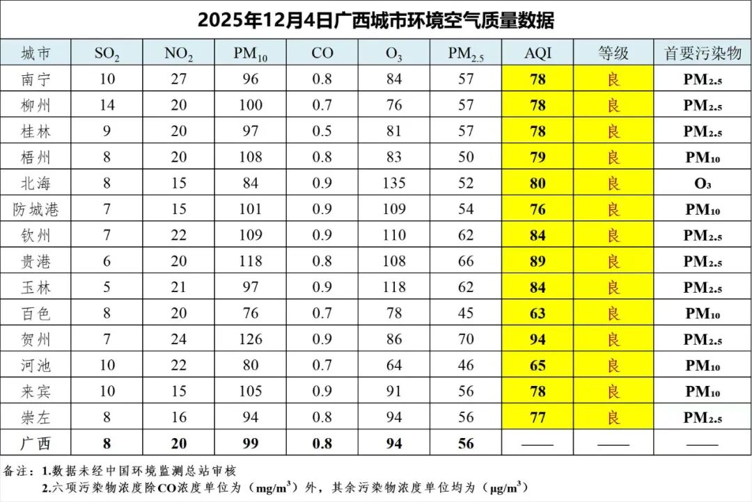 12月4日广西城市环境空气质量数据