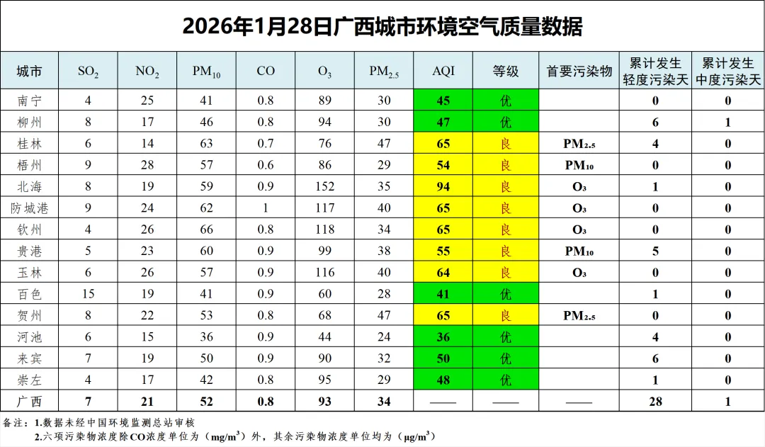 1月28日广西城市环境空气质量数据