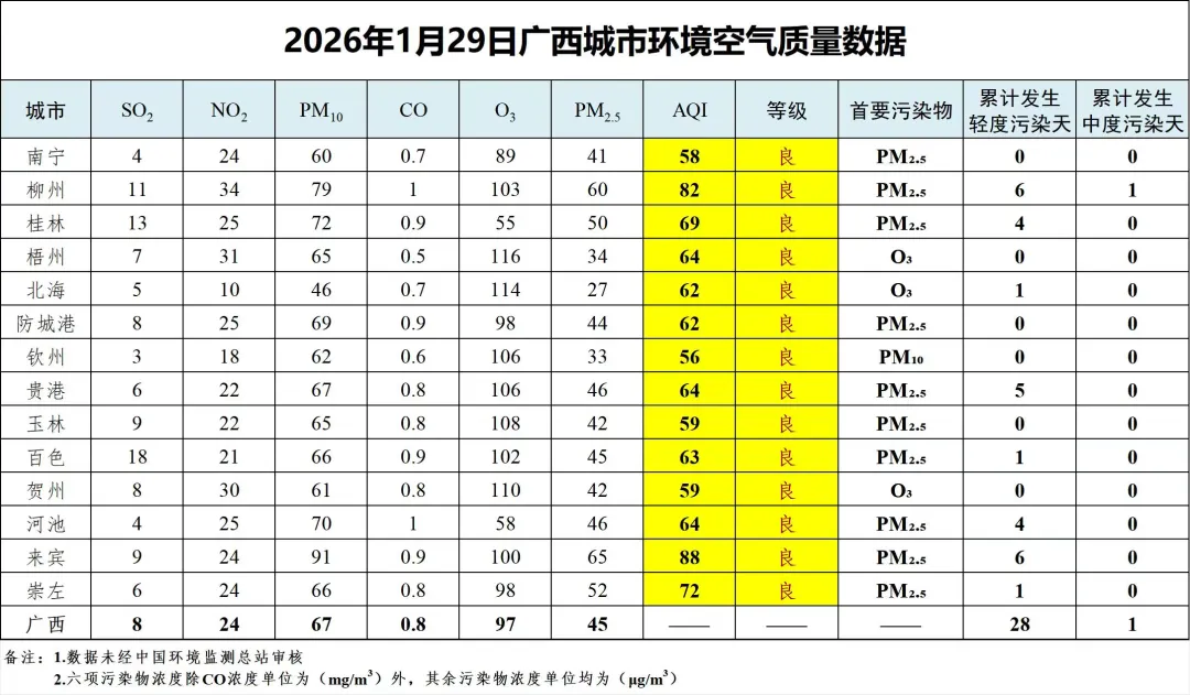 1月29日广西城市环境空气质量数据