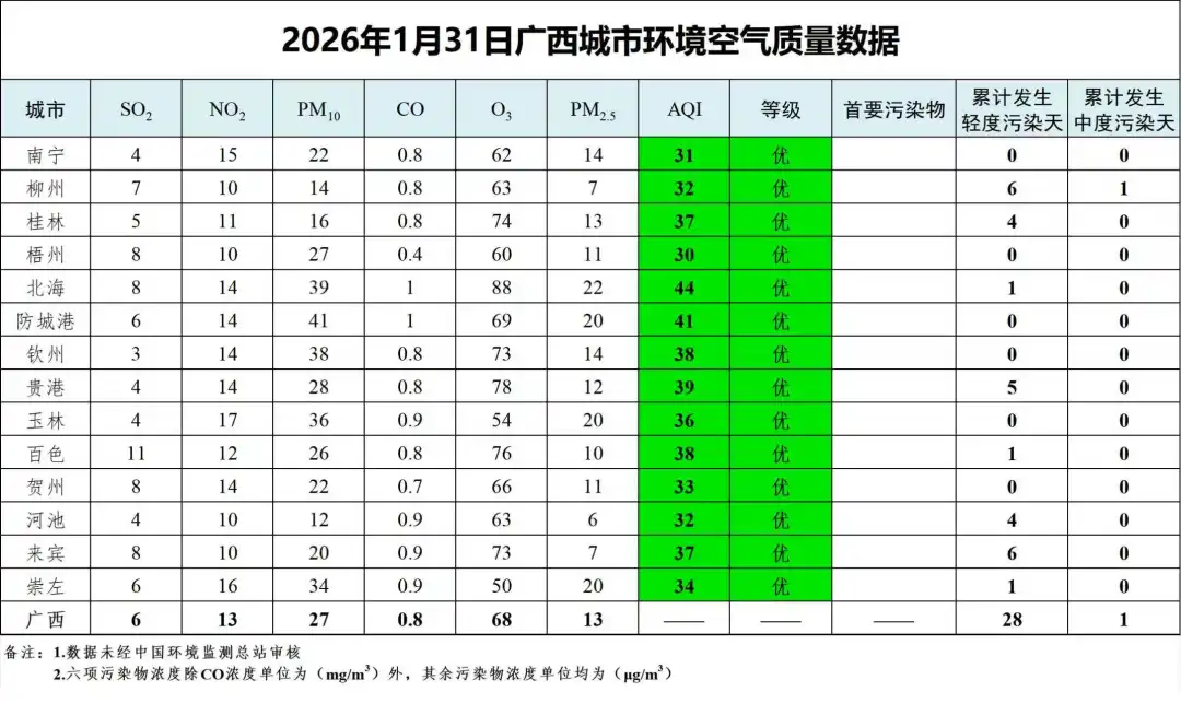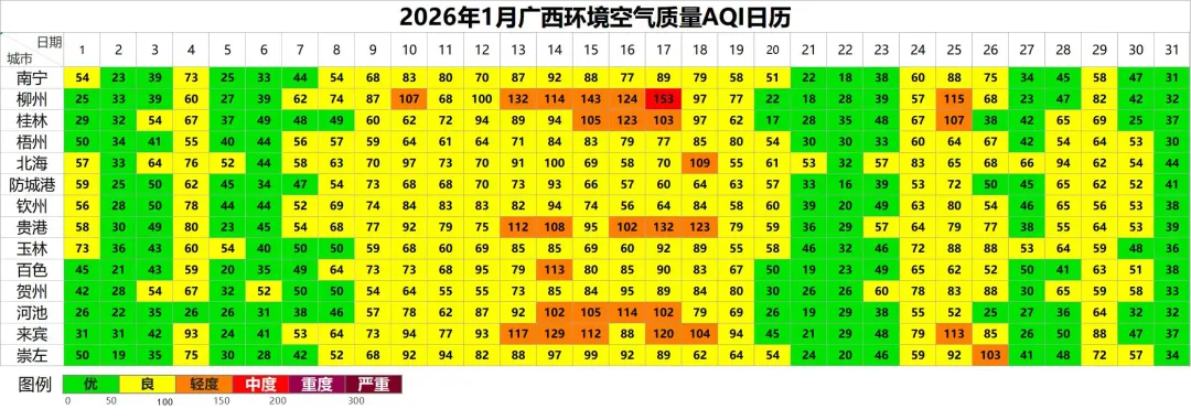 1月31日广西城市环境空气质量数据及1月广西环境空气质量AQI日历