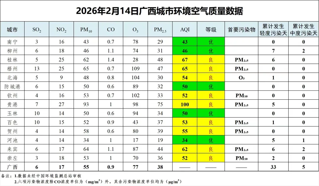 2月14日广西城市环境空气质量数据